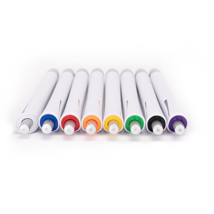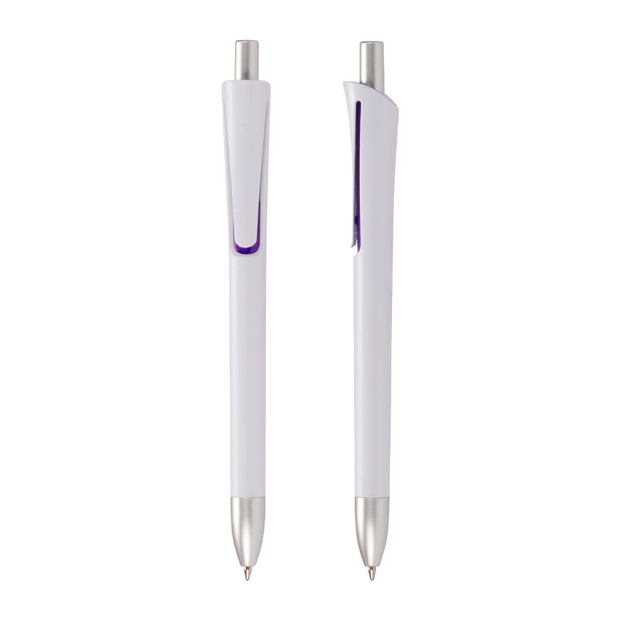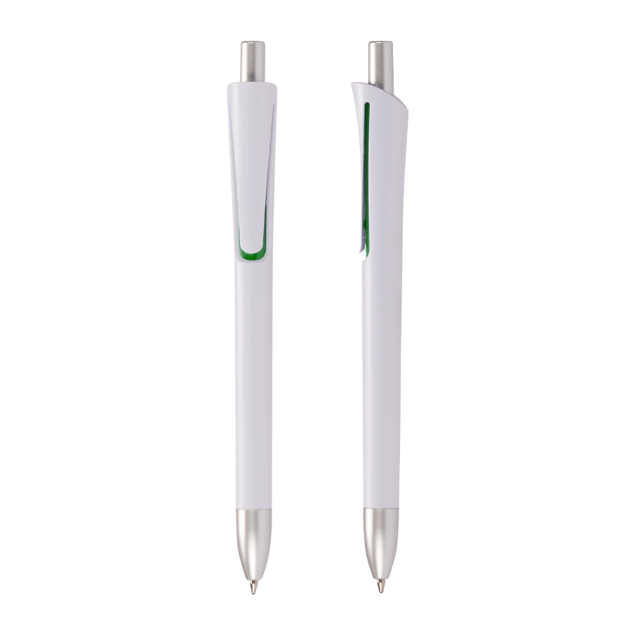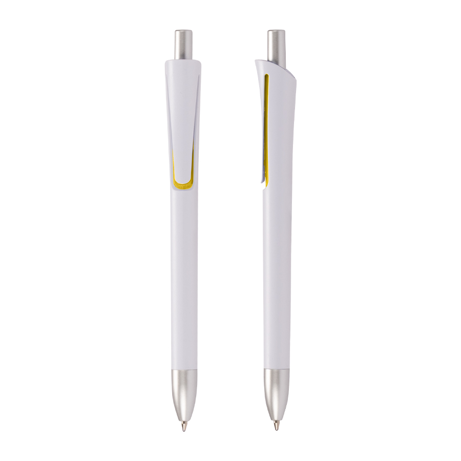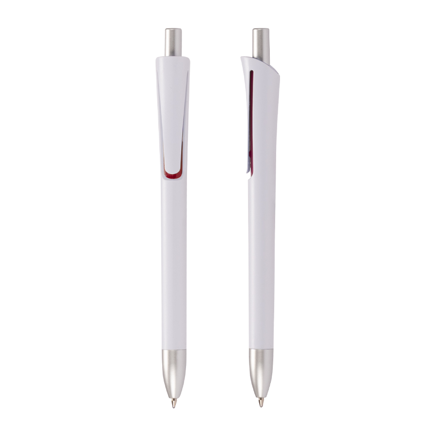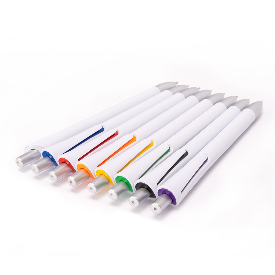Bolígrafo plástico con cuerpo blanco mate, terminales plateados y detalle bajo el clip de color. Escritura azul.