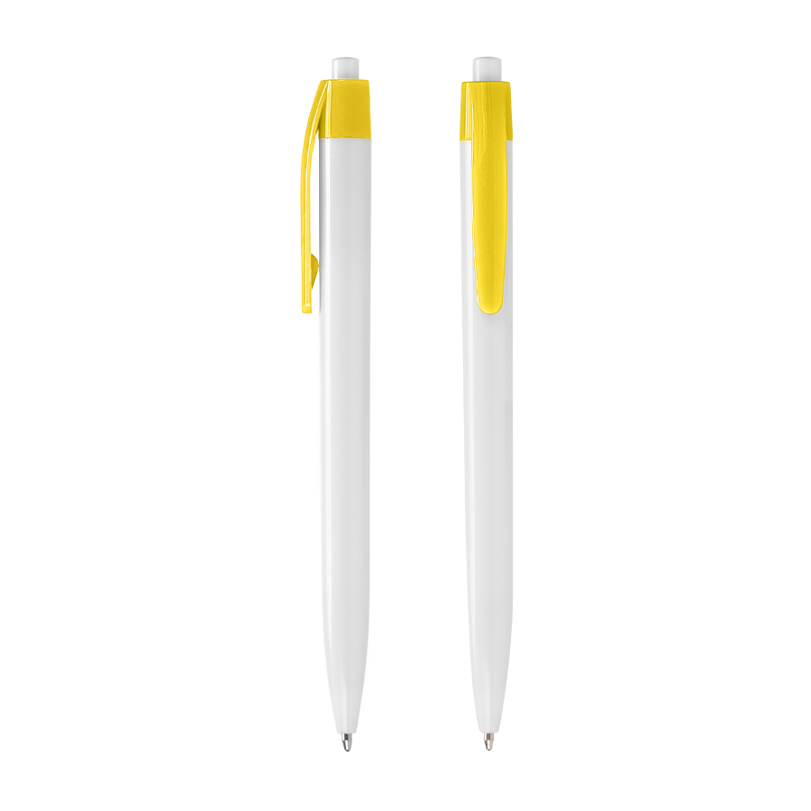Bolígrafo plástico cuerpo blanco y clip de color. Escritura azul.