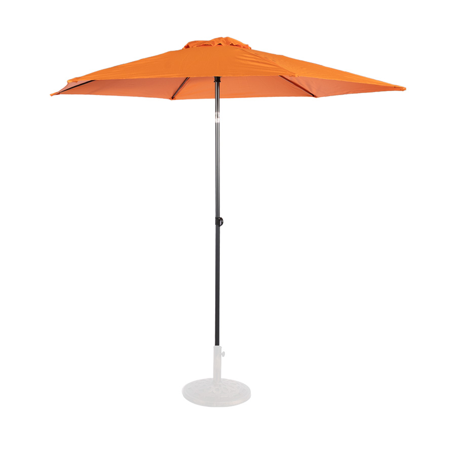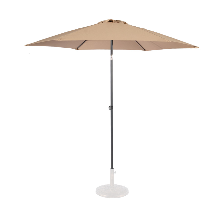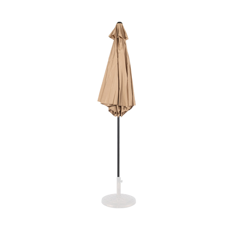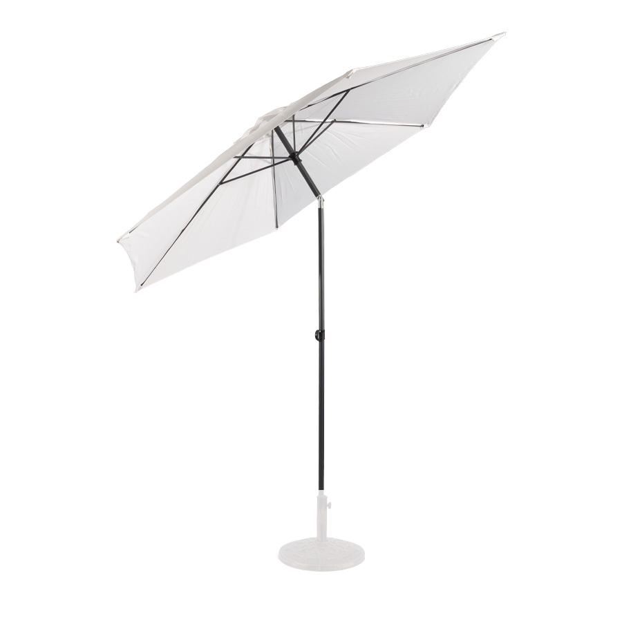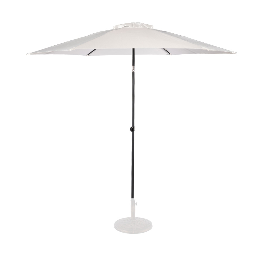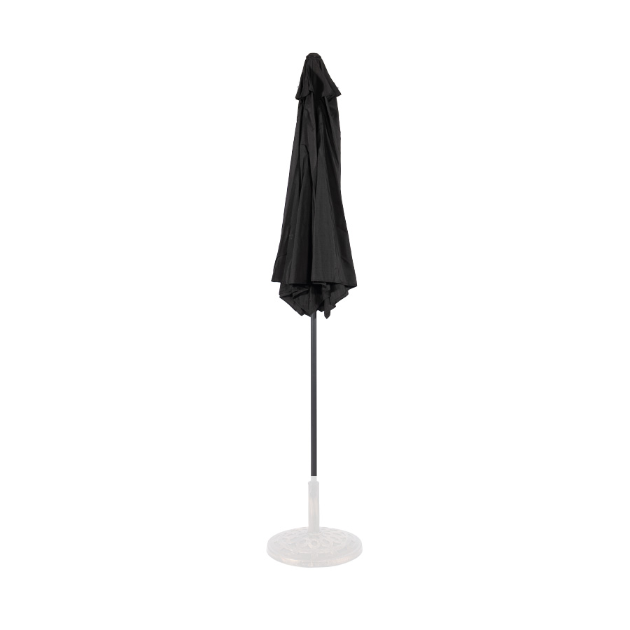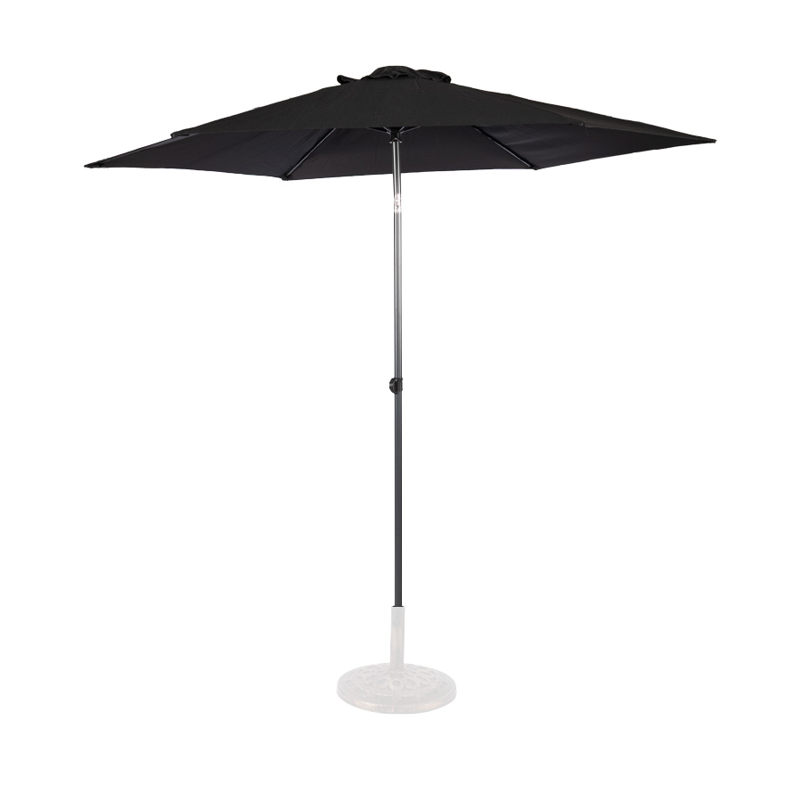 Quitasol redondo modelo «RAVELLO» de 2.5m de diámetro, con 6 cascos de lona Poliéster UV impermeable de 160g. Estructura asta central de 3.2cm diámetro x 1.6mm de espesor + 6 varas de 6x10mm, ambos Acero con pintura electrostática color negro, altura 2.3m, con sencillo sistema de apertura manual. Incluye codo giratorio de 45°. NO INCLUYE BASE.