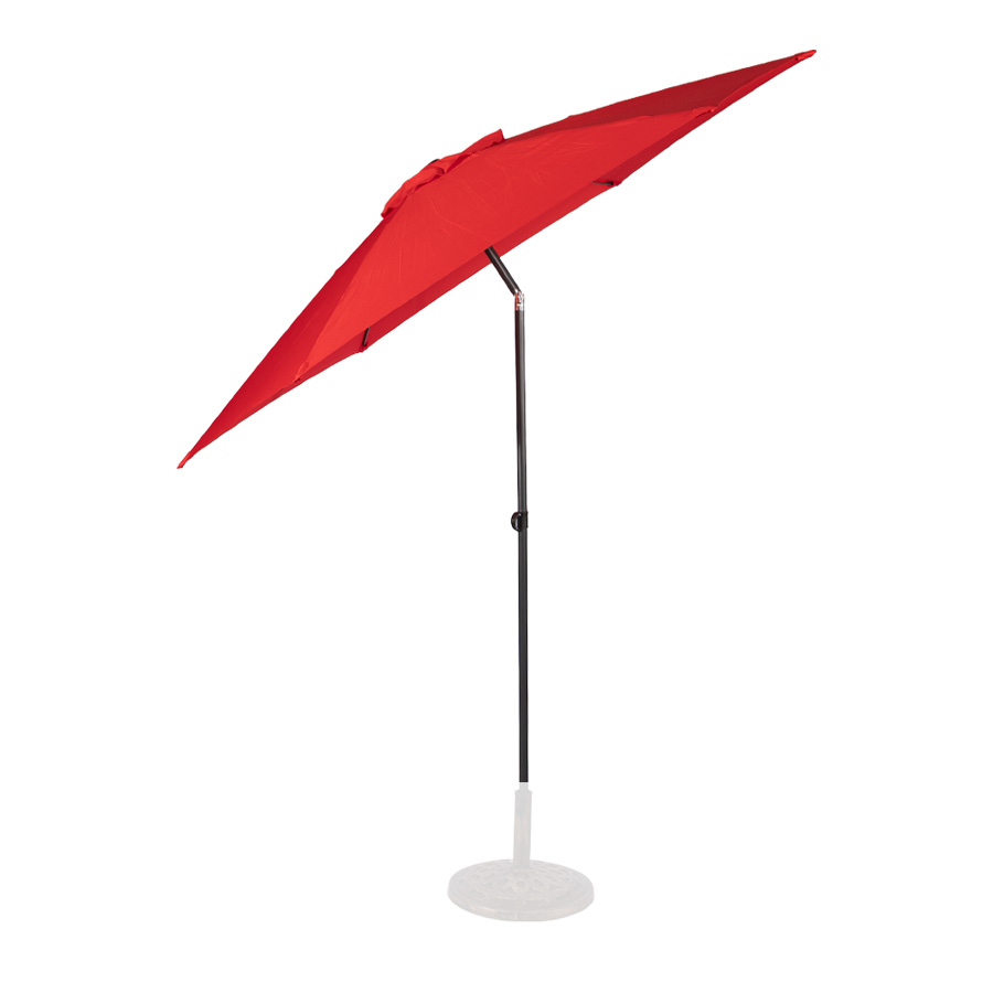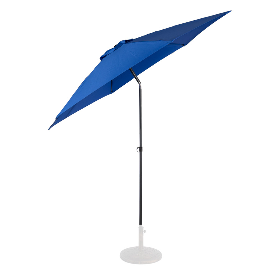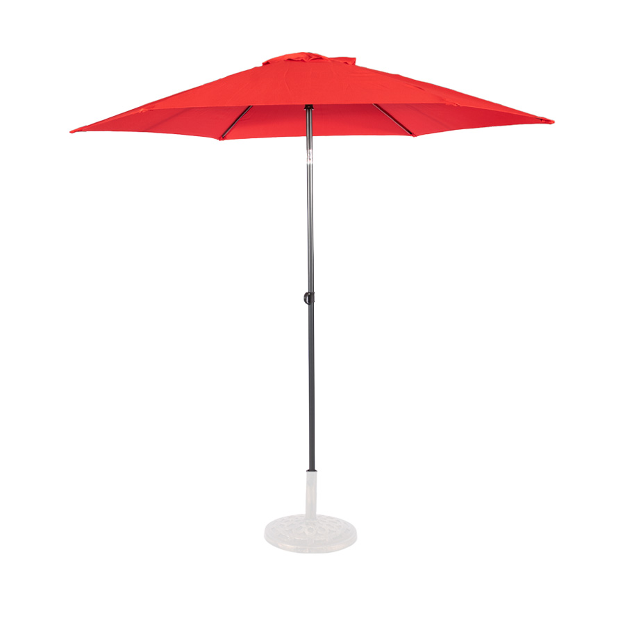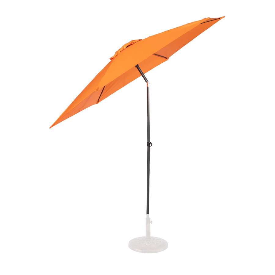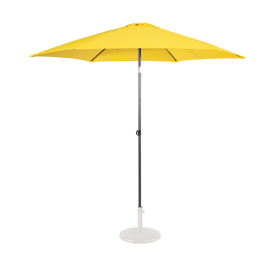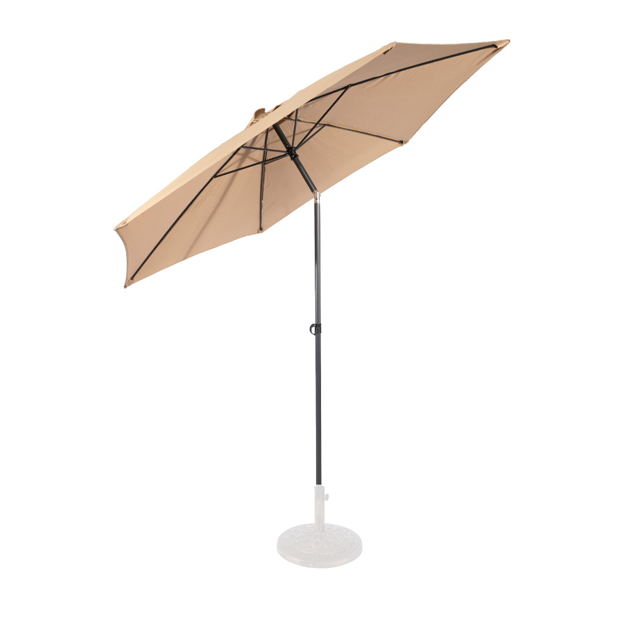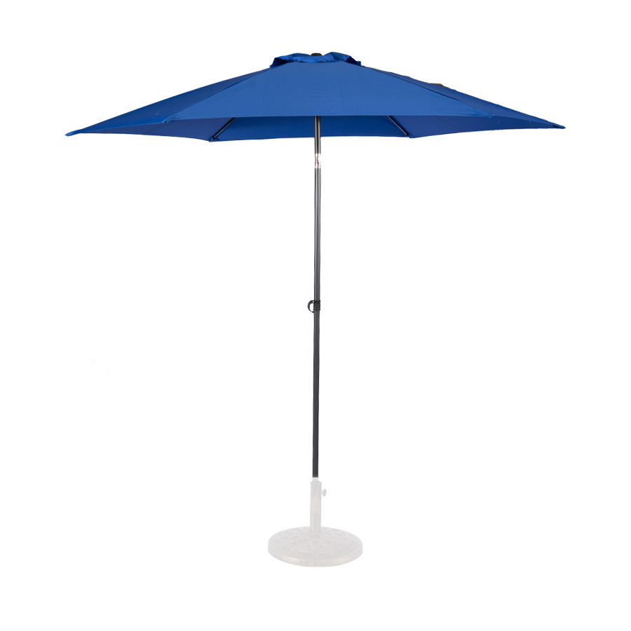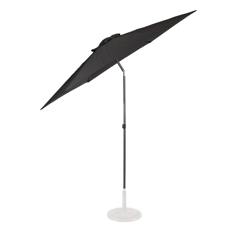 Quitasol redondo modelo «RAVELLO» de 2.5m de diámetro, con 6 cascos de lona Poliéster UV impermeable de 160g. Estructura asta central de 3.2cm diámetro x 1.6mm de espesor + 6 varas de 6x10mm, ambos Acero con pintura electrostática color negro, altura 2.3m, con sencillo sistema de apertura manual. Incluye codo giratorio de 45°. NO INCLUYE BASE.