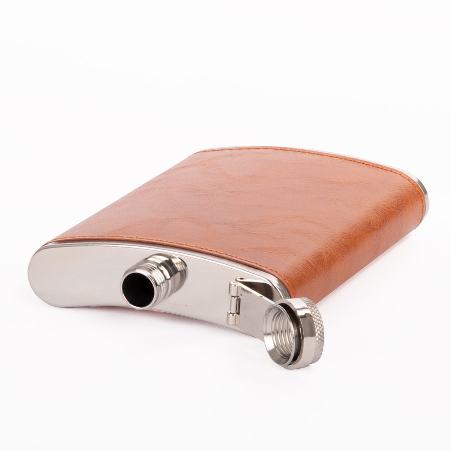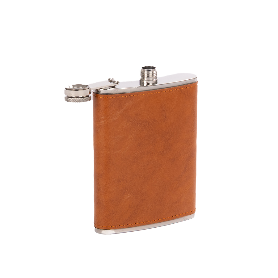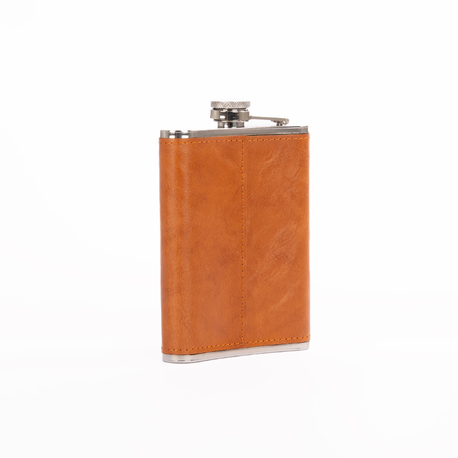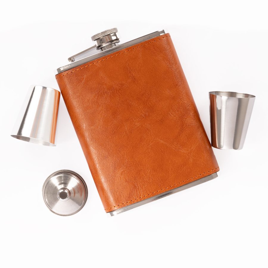 Set Petaca Licorera con cubierta de eco-cuero café claro (color caramelo) + 2 vasitos + 1 embudo de Acero Inoxidable SS304, modelo «OXFORD». Capacidad Petaca 8 oz (237 ml). Presentación en elegante estuche de cartón forrado negro con tapa. Interior cama aterciopelada negra.